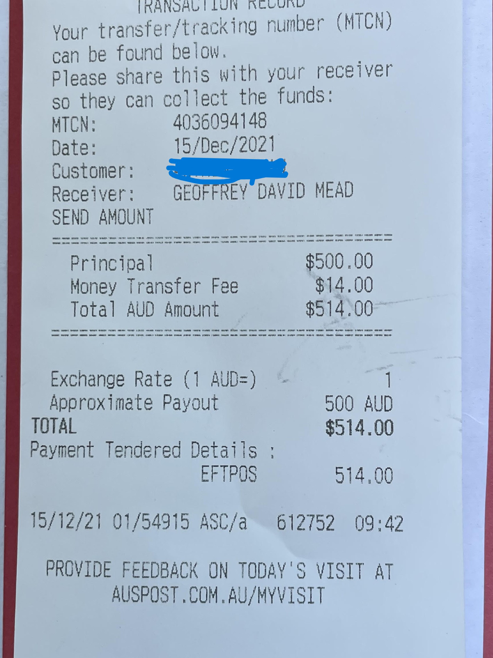 On December 15th 2021 G D Mead received a donation of AUD500 and has asked us to show the receipt here.